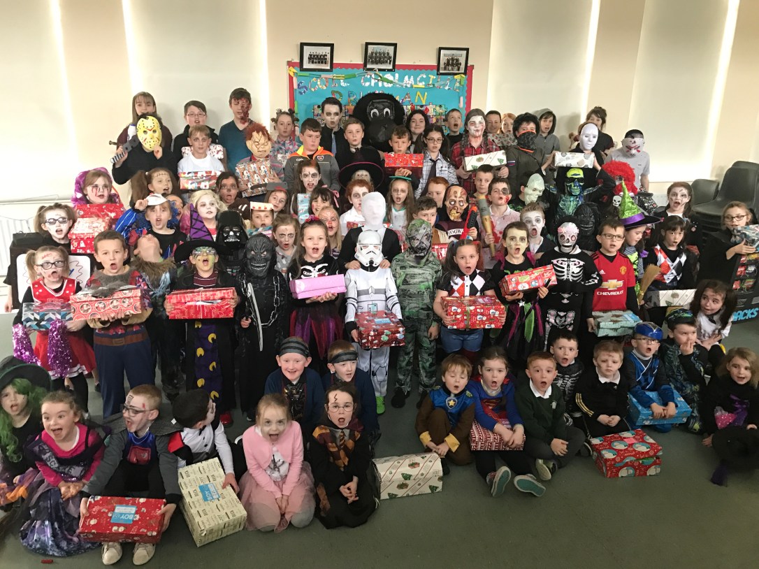 All the children dressed up for Hallowe’en pictured with their shoeboxes all set to be collected and sent to children in need. Thank you to all the parents and children for getting involved