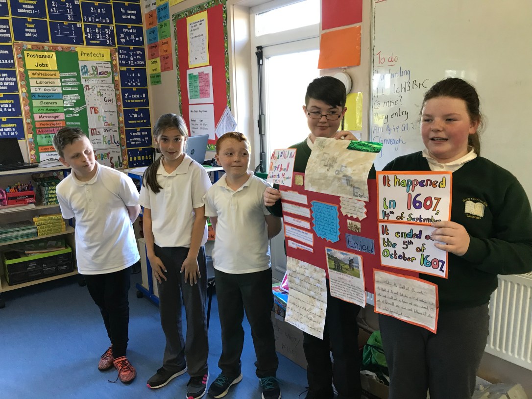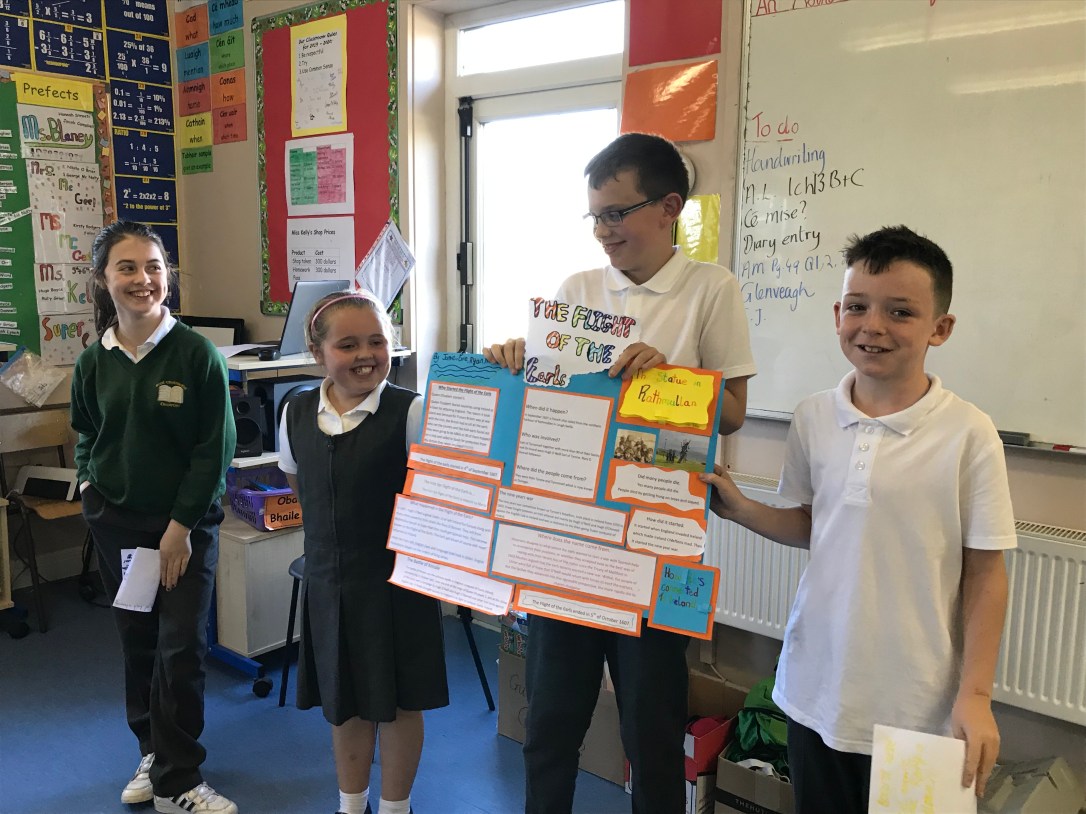 Fifth and sixth classes completed fantastic projects following a lot of research into the Flight of the Earls. Today both classes went on tour to Rathmullan, Ramelton and Doon Rock to bring all their learning to life.