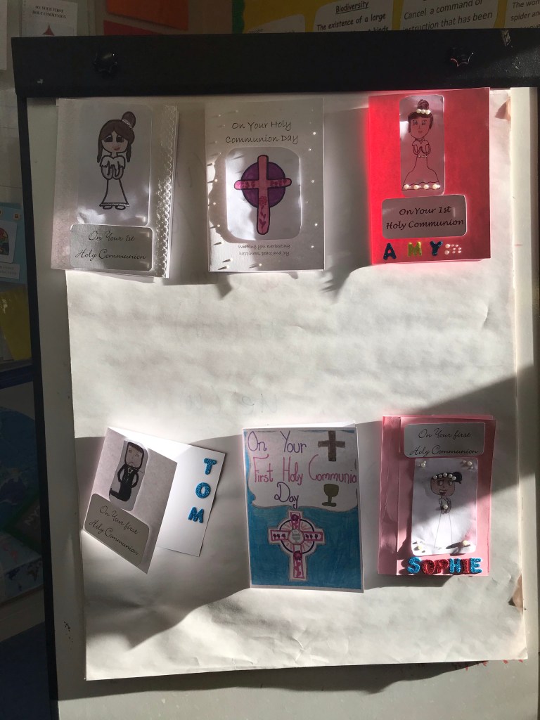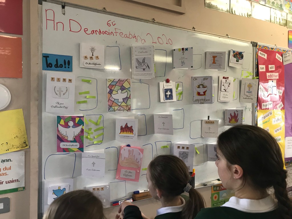 We have been very busy in fifth and sixth class designing both Communion and Confirmation cards under the wonderful guidance of school parents Roy and Claire Graham from Eventful. We have sent our cards to print and are getting excited for the launch of our business ‘Colmcille Cards’. We are very lucky that Claire and Roy came into look at our ideas in school and have come onboard with evidence and even a loan of equipment to get us started. Watch this space for further information on our endeavour 🙌🏻 details of how to order and where to purchase will be coming soon!!!