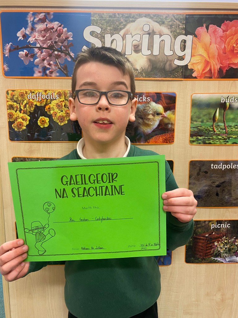 This week ‘Gaeilgeoir na Seachtaine’ was awarded to Ben for his excellent use of Irish in school. Maith thú Ben!