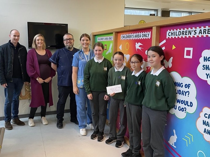 Pictured are Anthony Mc Glynn, Feena Mc Ateer, Peter Doherty, children’s nurse Lauren and Drumman students Hannah, Aoife, Niamh & Caitlín.