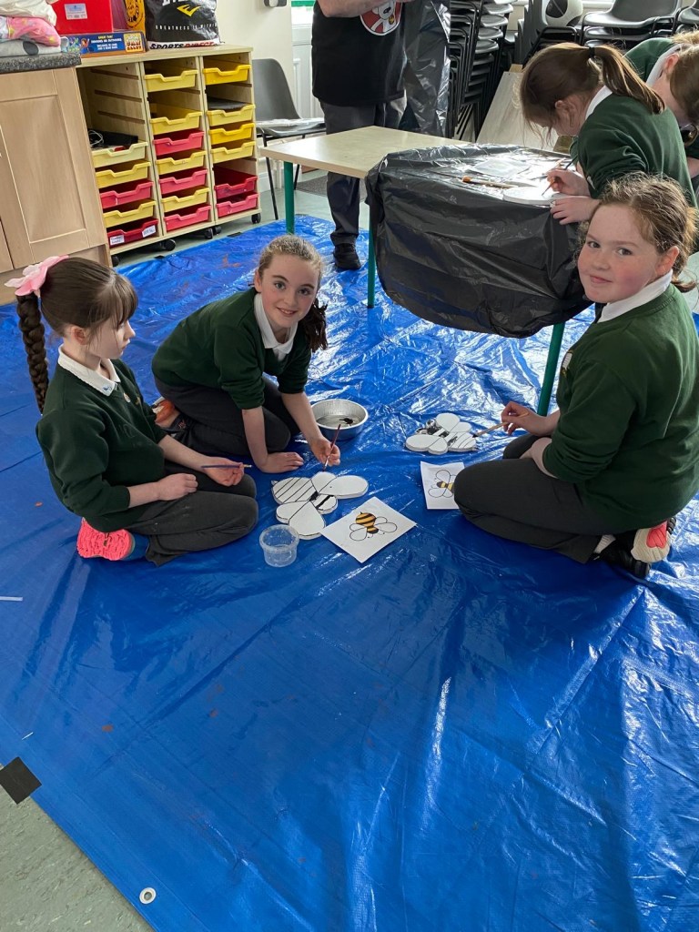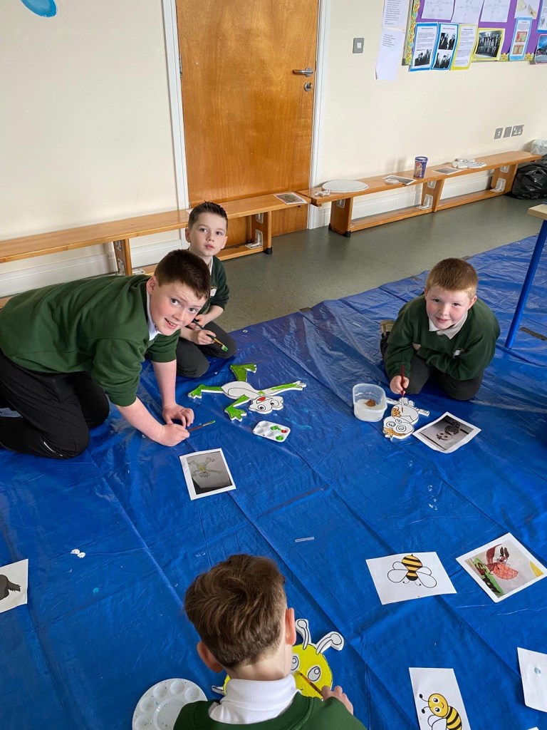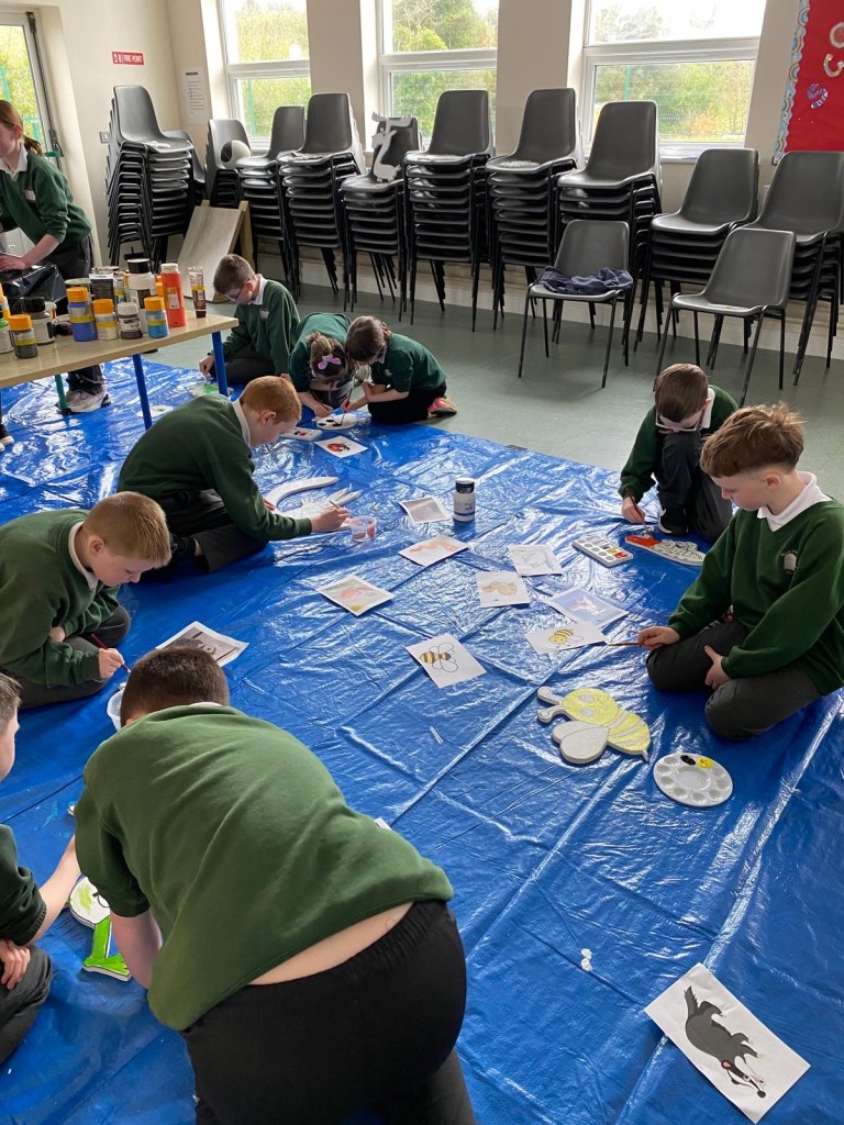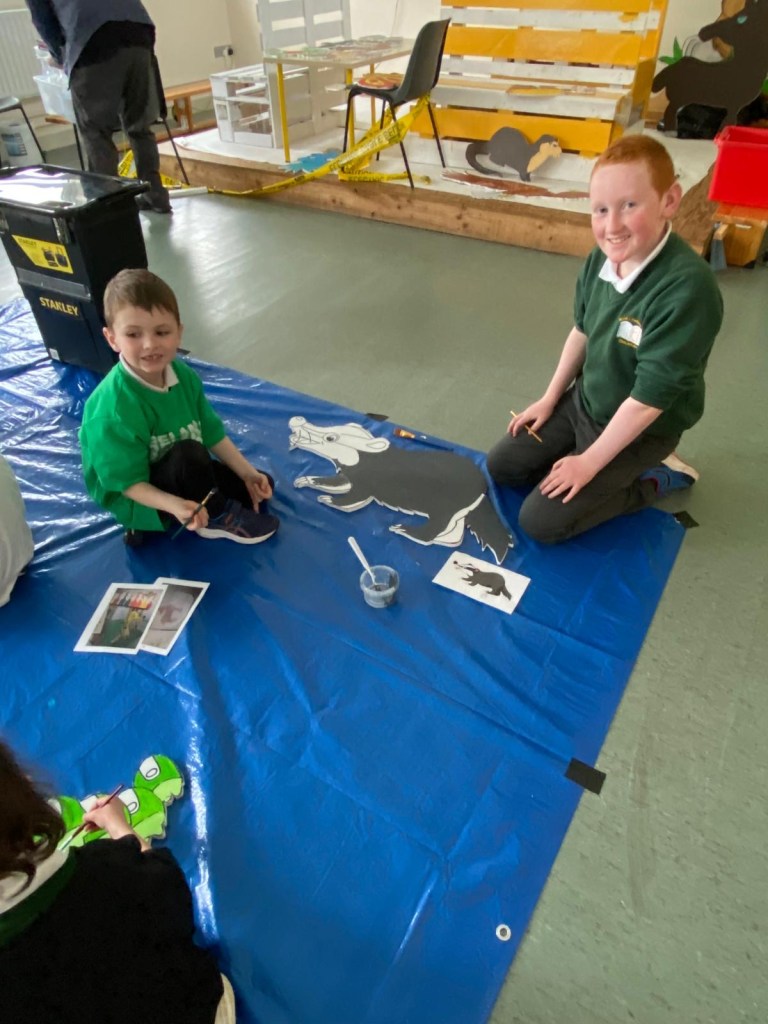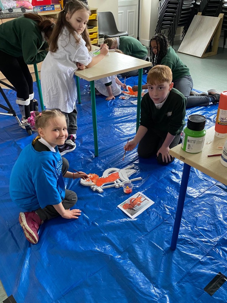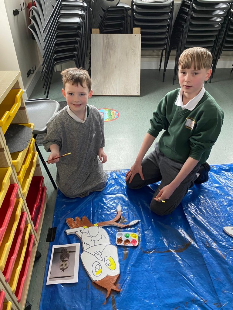 The school’s creative team are having great fun doing up our new creative space. This week we had Mickey Mc Fadden in school helping us with the wooden animals that we are adding along side our beautiful mural. The children drew pictures of woodland creatures and Mickey projected the drawings on wood and carved them out. The boys and girls then painted the wooden carvings.