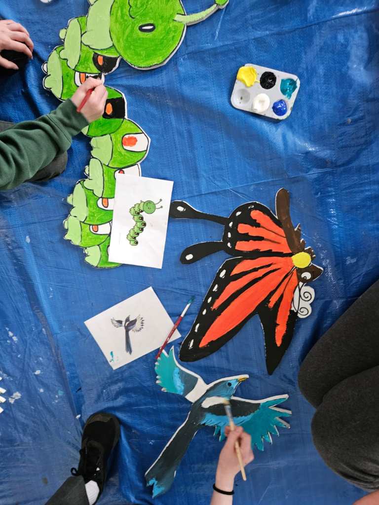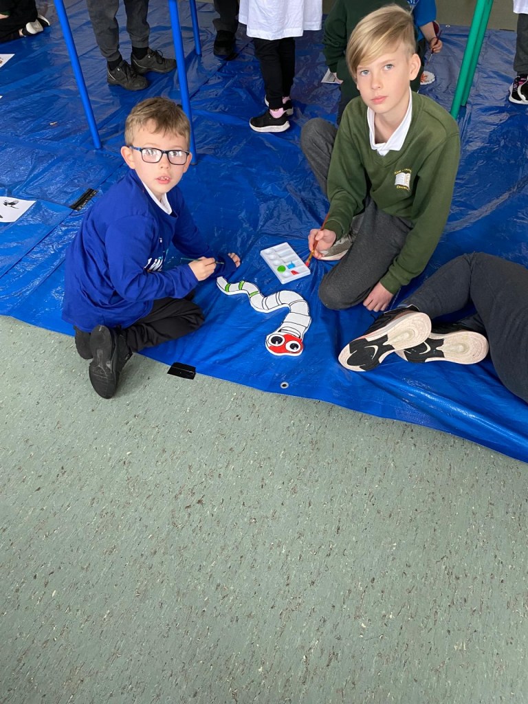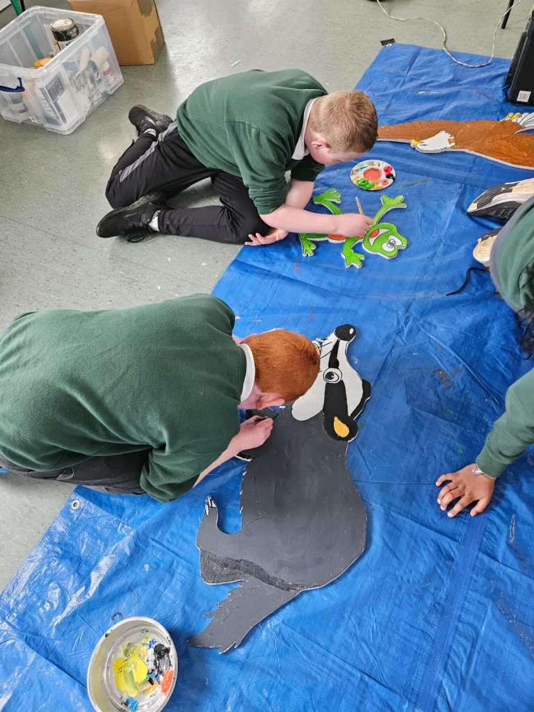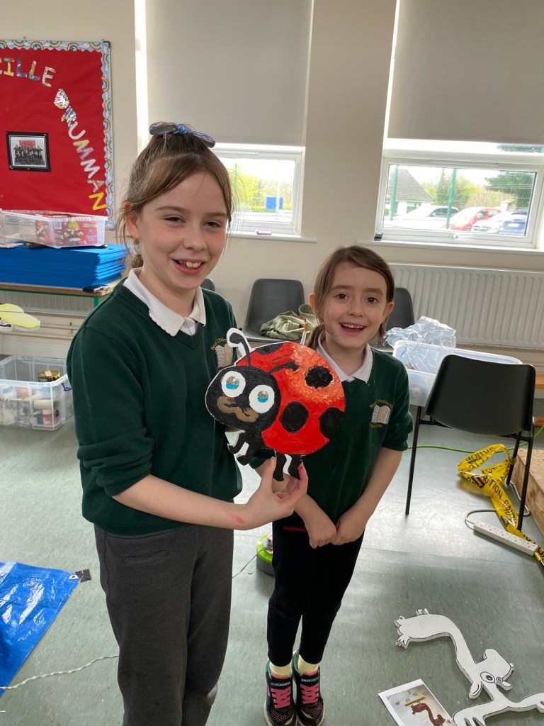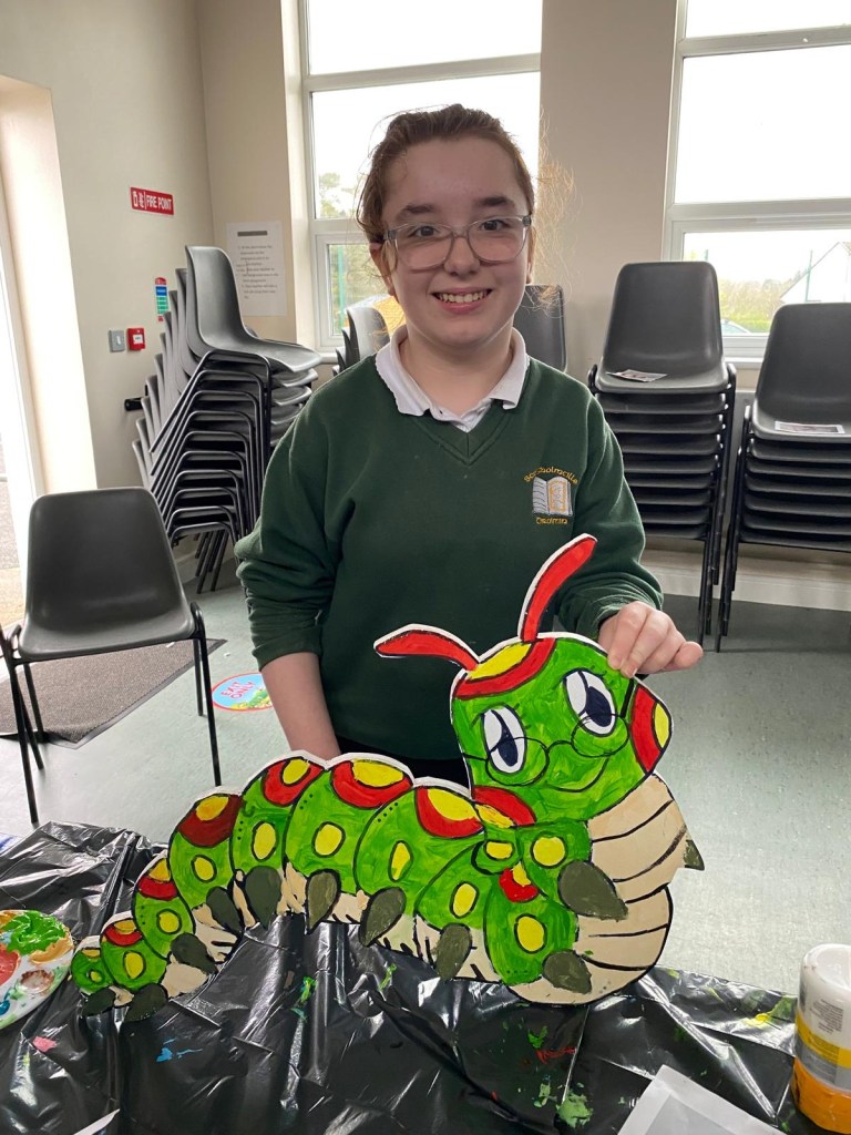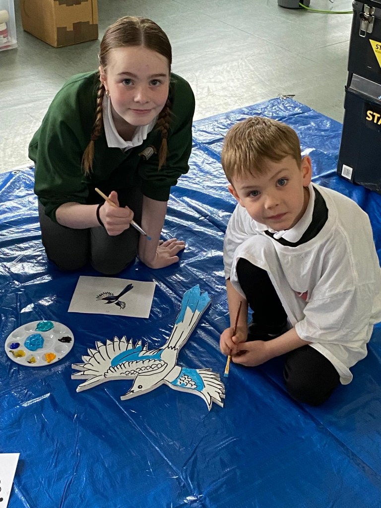 The school’s creative team are having great fun doing up our new creative space. This week we had Mickey Mc Fadden in school helping us with the wooden animals that we are adding along side our beautiful mural. The children drew pictures of woodland creatures and Mickey projected the drawings on wood and carved them out. The boys and girls then painted the wooden carvings.