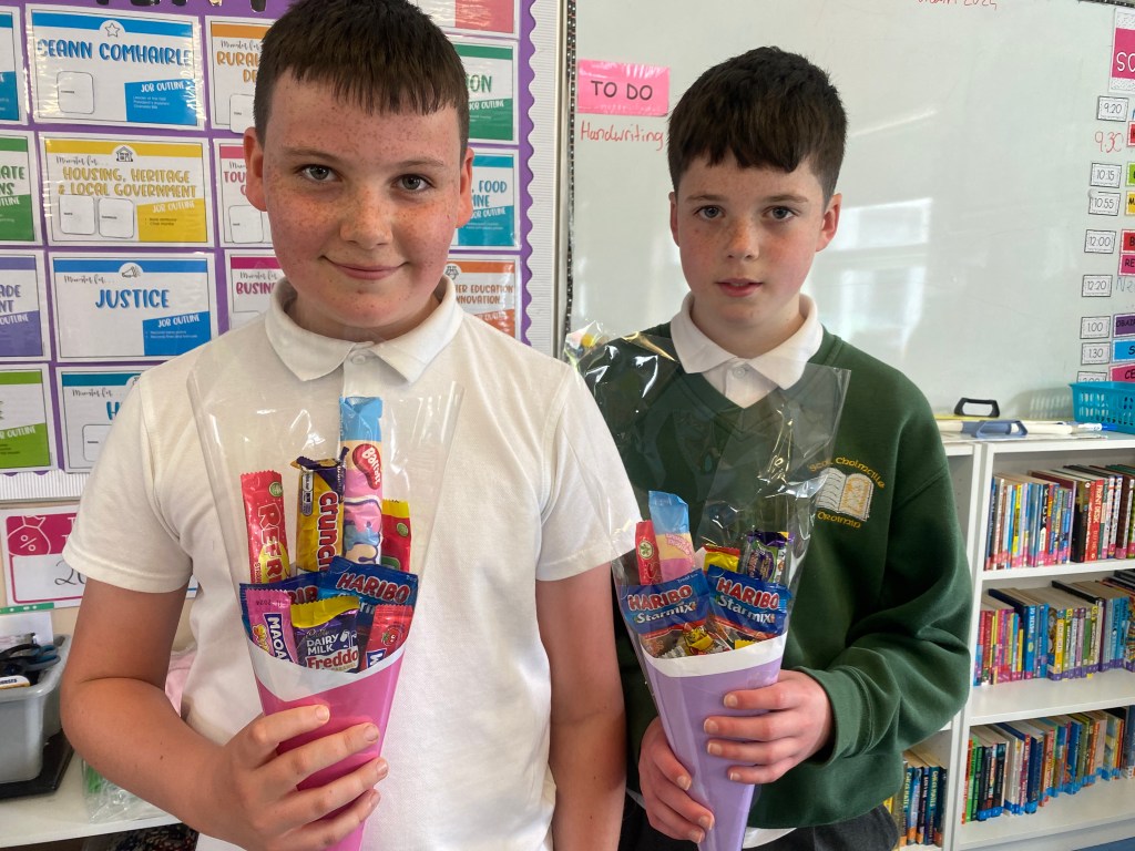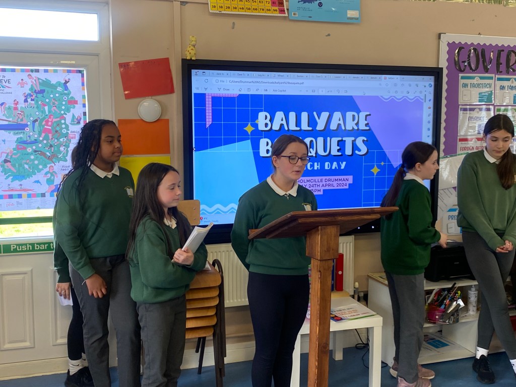 The students presented their business ideas in the Dragon’s Den made up of Mrs Mc Gee, Mrs Martin and Bernard Gallagher of CBM designs. Following the win of the sweet bouquets, Ballyare Bouquets came into production charging €5 a bouquet.