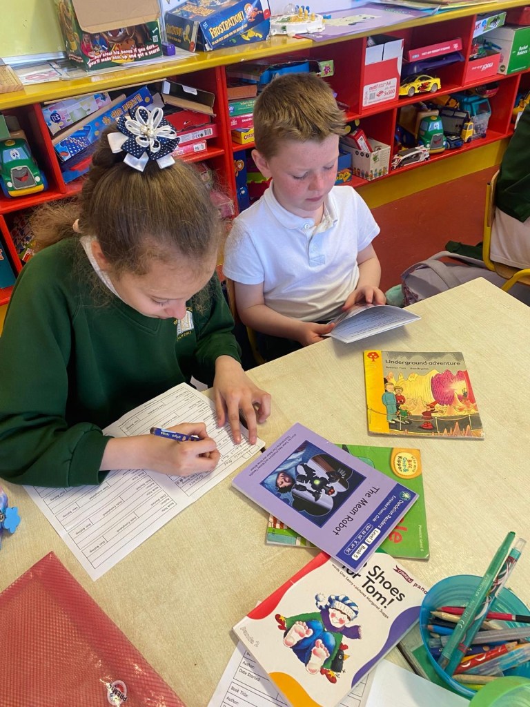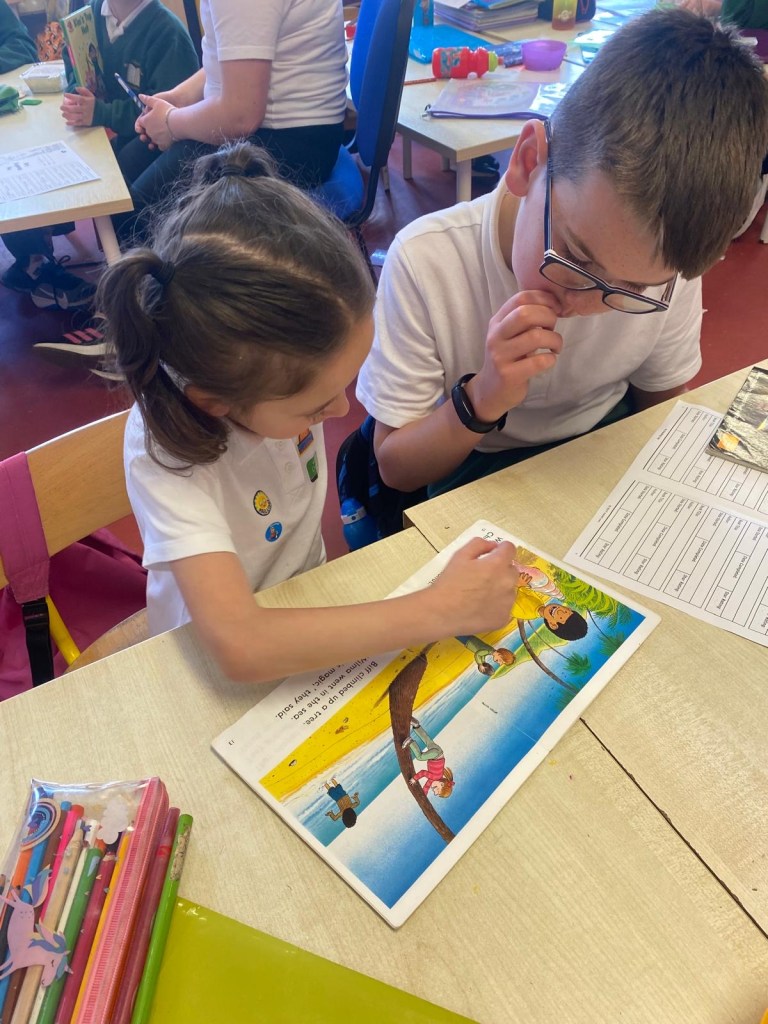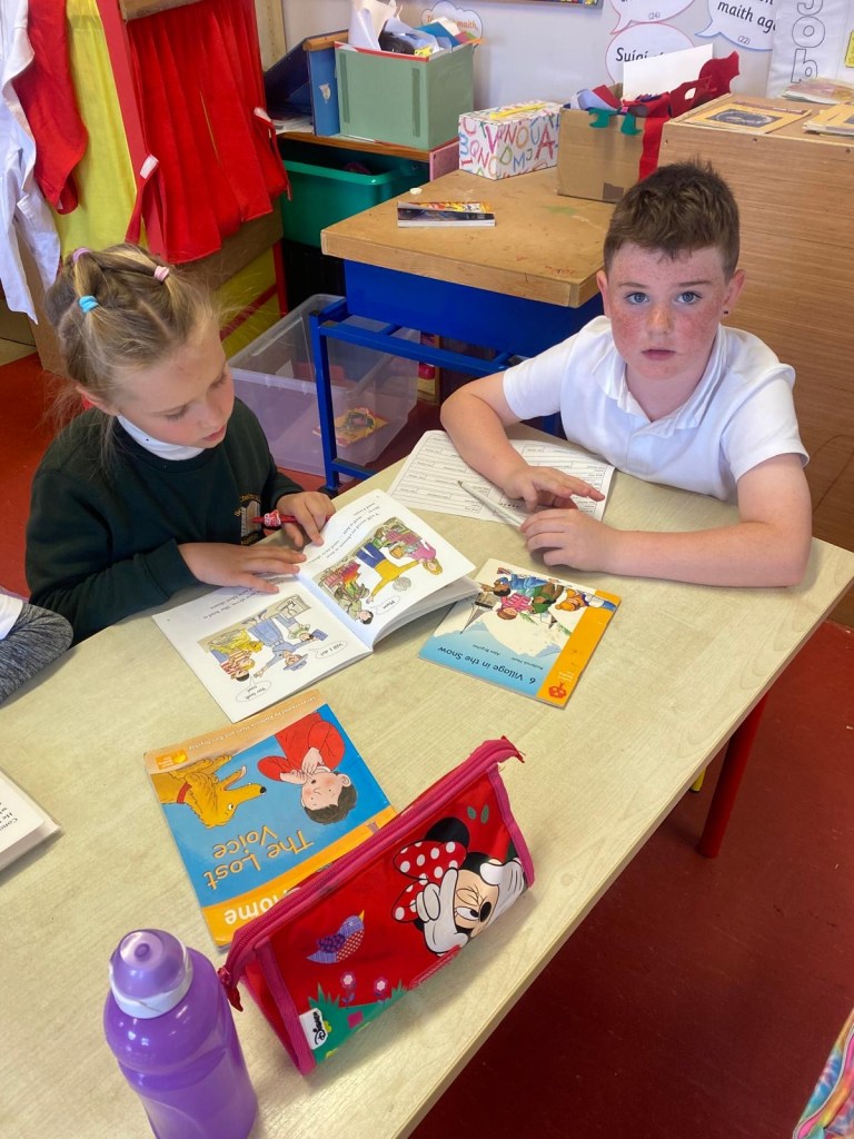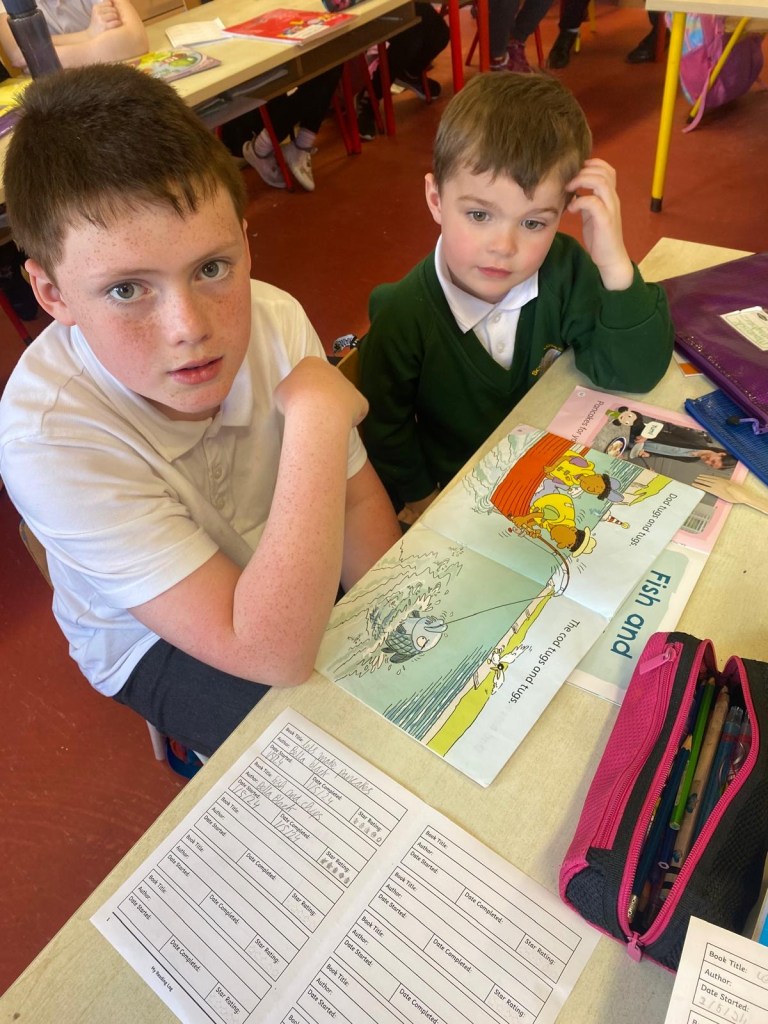 We are following the “buddy reading” programme in Drumman where older and younger students are paired up to spend time with books and read together. Buddies, buddy up in different classrooms and sit and read together.