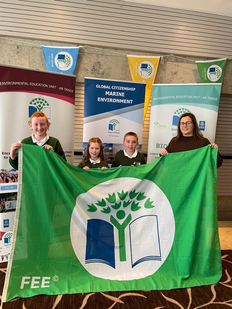 Today was a very special day for our school as three lucky members of the Green Schools Committee had the exciting opportunity to travel to the Radisson Hotel in Letterkenny to collect our school’s 8th Green Flag!