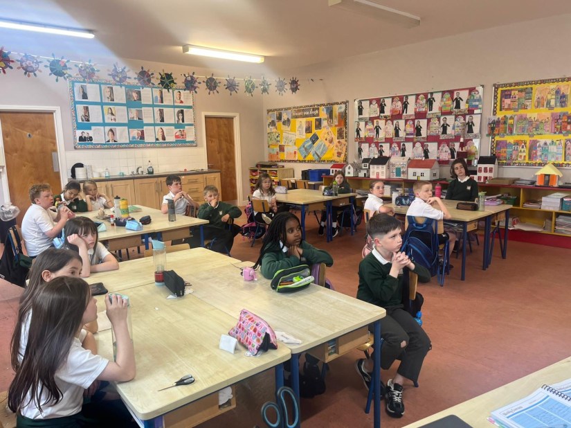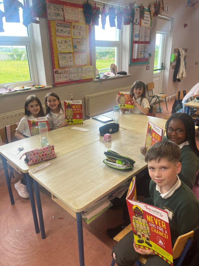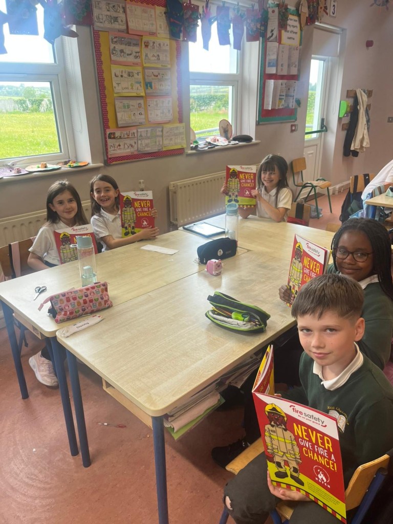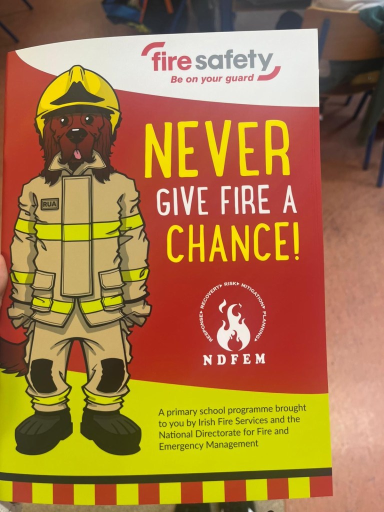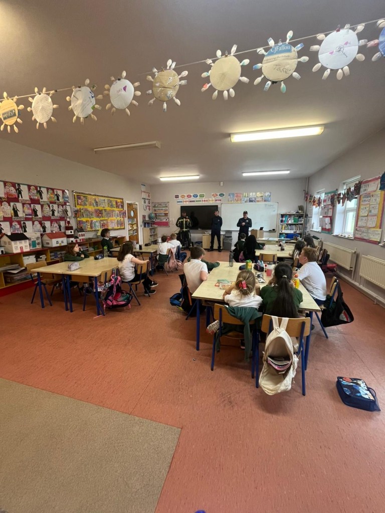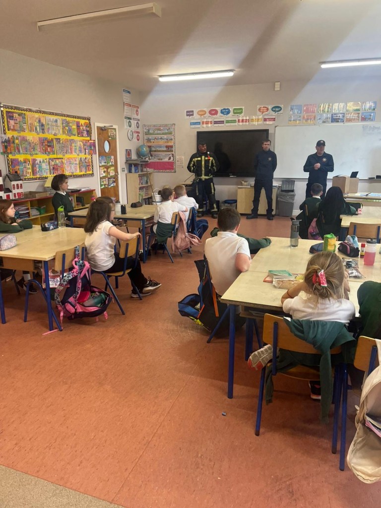 The firemen spoke to the pupils about what to do in case of a fire, how to stay safe at home and at school, the importance of smoke alarms and when and how to call emergency services. They spoke about some of the equipment they use, from helmets and hoses to breathing gear.