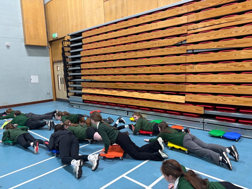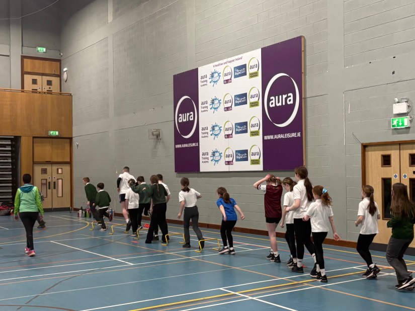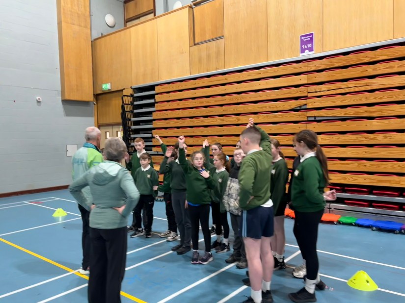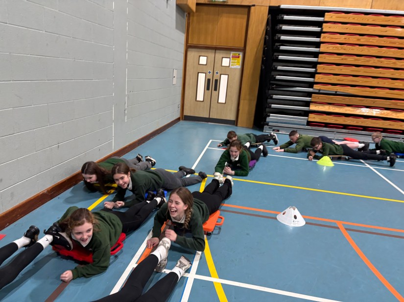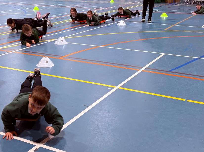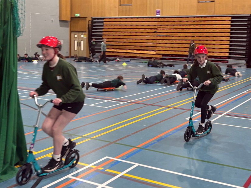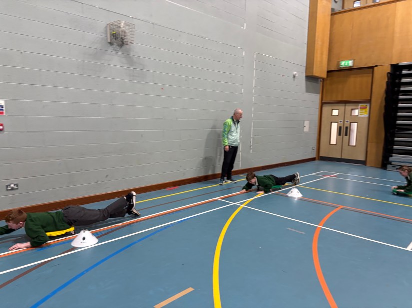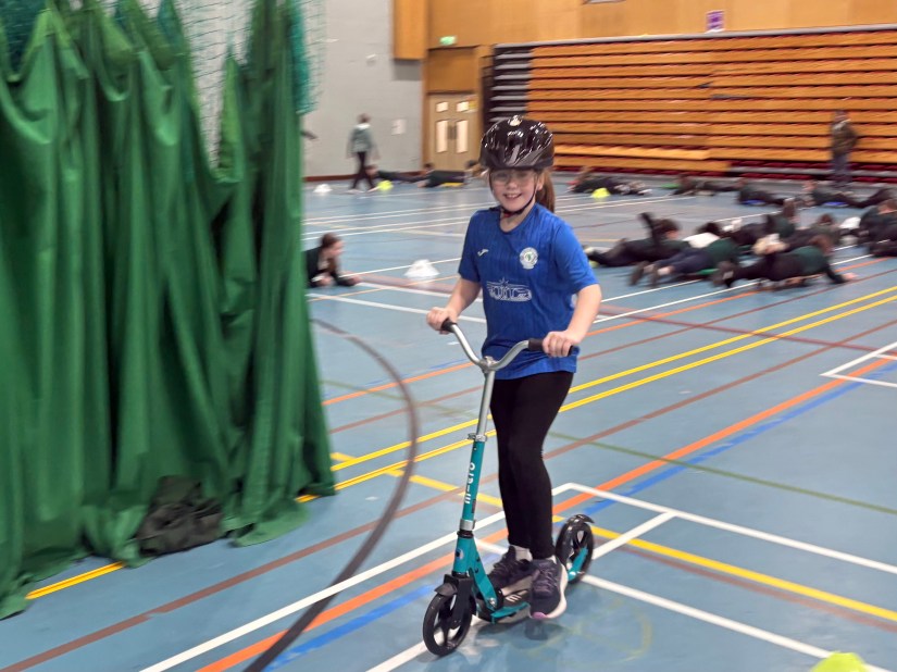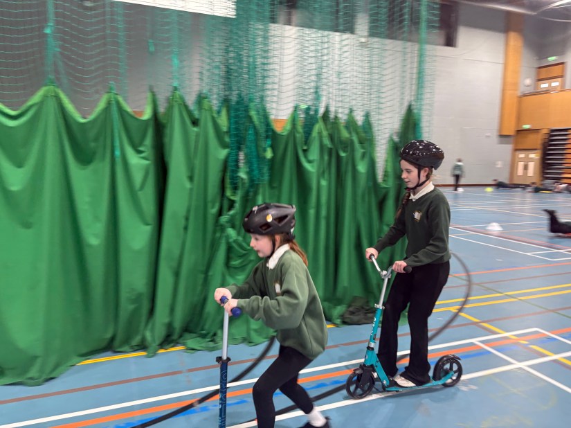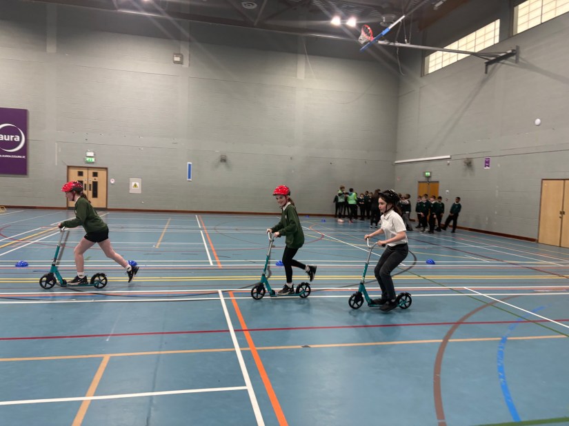 They experienced indoor swimming on wheeled boards and practiced cycling skills on scooters. They also took part in obstacle courses designed to challenge their speed agility and coordination. Throughout the session they mixed and competed with students from Ballyraine NS making new friends and sharing in the fun of the event.