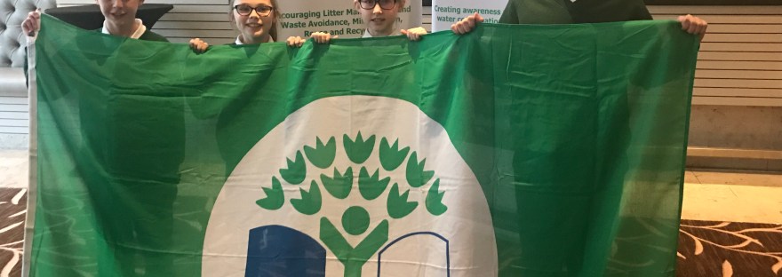 Four representatives from the Drumman Green Schools Team Jamie Ward, George Mc Nulty, Niamh Mc Laughlin and Ruby Grier pictured accepting Drumman's fifth renewal green flag. Congratulations to all the boys and girls in fifth and sixth who have worked very hard on this. Well done to all